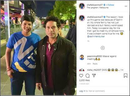 Teenage sensation Shafali Verma fulfilled her childhood dream of meeting her idol Sachin Tendulkar when she caught up with the Master Blaster in Australia. The 16-year-old clicked a picture with Sachin Tendulkar and uploaded it on her Instagram account with a heart-warming post.