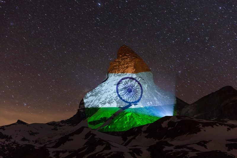 Swiss Light Artist Gerry Hofstetter projects the Indian flag amongst flags of different nations on the mountain peak of Matterhorn @ Zermatt.