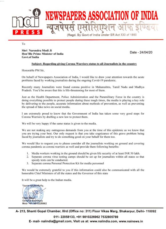 एक तबका वह है जो चिकित्सकों व पुलिसकर्मियों की तरह ही 24 घंटे अपने प्राणों को दांव पर लगाकर जनमानस को इस काल की वास्तविकता से परिचित कराने के लिए सुबह-शाम अपनी पत्रकारिता से सबको स्थिति बता रहा है । पत्रकारों पर चिकित्सकों और पुलिसकर्मियों की भांति इस कोरोना और लॉकडाउन के समय में कई हमले भी हुए , यही वजह रही कि न्यूजपेपर एसोसिएशन ऑफ इंडिया के महासचिव विपिन गौड़ ने प्रधानमंत्री नरेन्द्र मोदी को अनुरोध पत्र लिखा जिसमें पत्रकारों को भी कोरोना वॉरियर्स का दर्जा दिए जाने की मांग की और ऐसी आशा प्रकट की ताकि इससे पत्रकारों का मनोबल बढ़े ।