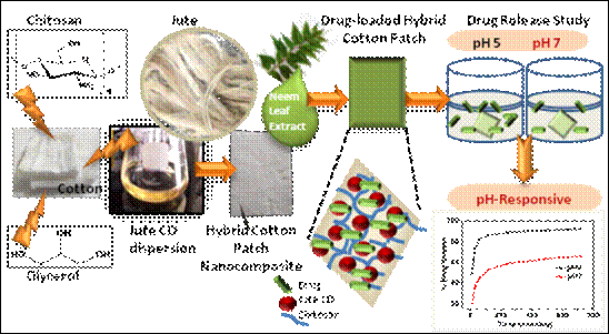 This study published in the journal ACS Sustainable Chem. Eng. demonstrated the stimuli-responsive drug delivery system using natural products – jute and neem leaf extract. The jute carbon dots were immobilized in the hydrogel matrix-bound cotton patch and could effectively exemplify different drug release pattern at two different pH levels –lower at pH 5 than at higher at pH 7.