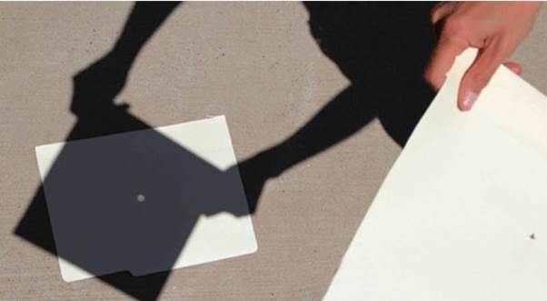 Cover the ‘compact’ makeup kit mirror with black paper, with a small hole at the centre. Reflect the image of the Sun on a distant wall in shadow. You can get a projected image of the eclipsed Sun.