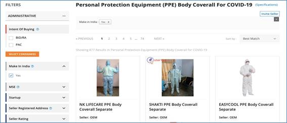 GeM has also enabled a provision for indication of the percentage of local content in products. With this new feature, now, the Country of Origin as well as the local content percentage are visible in the marketplace for all items. More importantly, the ‘Make in India’ filter has now been enabled on the portal. Buyers can choose to buy only those products that meet the minimum 50% local content criteria. In case of Bids, Buyers can now reserve any bid for Class I Local suppliers (Local Content > 50%). For those Bids below INR 200 crore, only Class I and Class II Local Suppliers (Local content > 50% and > 20% respectively) are eligible to bid, with Class I supplier getting purchase preference. Some Snapshots of the Local Content Features on the GeM Portal are shown in Annexure.