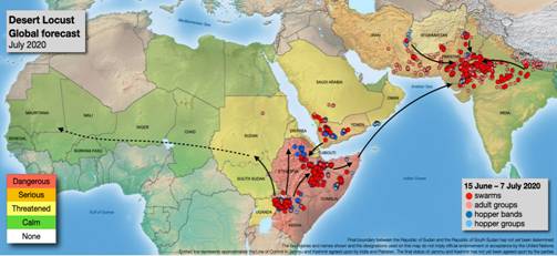 Today (22.07.2020), swarms of immature pink locusts and adult yellow locusts are active in Jaisalmer, Barmer, Jodhpur, Bikaner, Churu, Sikar, Nagaur, Jaipur, Pali, Hanumangarh, Sriganganagar and Dausa districts of Rajasthan.Food and Agriculture Organization’s Locust Status Update of 21.07.2020 indicates that the risk of swarm migration from Horn of Africa prevails in coming weeks. In Somalia, the swarms are moving eastwards across the north and a limited number of swarms could migrate across the Indian Ocean to the Indo-Pakistan border area; during the remainder of this month.