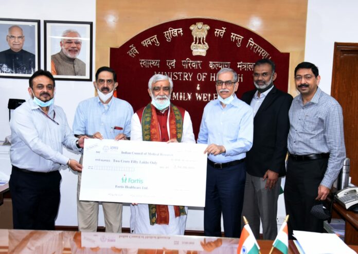Private sector medical service provider Fortis Healthcare handed over a cheque of Rs 2.5 crore to ICMR in the presence of Minister of State for Health and Family Welfare Shri Ashwini Kumar Choubey in his office.