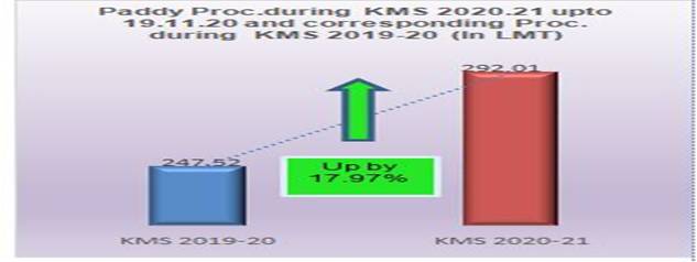 Paddy procurement for Kharif 2020-21 is continuing smoothly in the procuring States & UTs of Punjab, Haryana, Uttar Pradesh, Telangana, Uttarakhand, Tamil Nadu, Chandigarh, Jammu & Kashmir, Kerala, Gujarat, Andhra Pradesh Odisha and Maharashtrra with purchase of over 292.01 LMTs of paddy upto 19.11.2020 against the last year corresponding purchase of 247.52 LMT showing an increase of 17.97 % over last year. Out of the total purchase of 292.01 LMT, Punjab alone has contributed 200.74 LMT which is 68.74 % of total procurement.