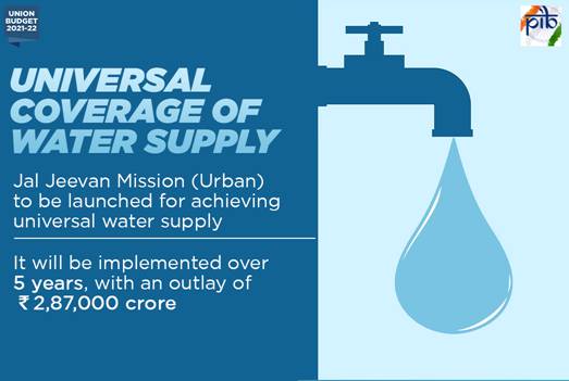 The Union Budget has announced launch of the Jal Jeevan Mission (Urban). It aims at universal water supply in all 4,378 Urban Local Bodies with 2.86 crore household tap connections, as well as liquid waste management in 500 AMRUT cities. It will be implemented over 5 years, with an outlay of Rs 2,87,000 crore.