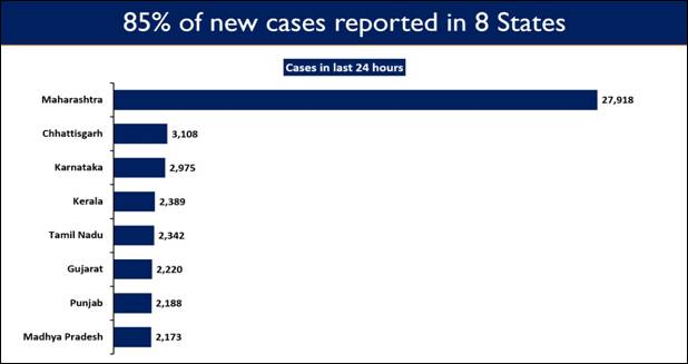Eight States, Maharashtra, Chhattisgarh, Karnataka, Kerala, Tamil Nadu, Gujarat, Punjab and Madhya Pradesh report a surge in the COVID daily new cases. 84.73% of the new cases are reported from these 8 states.