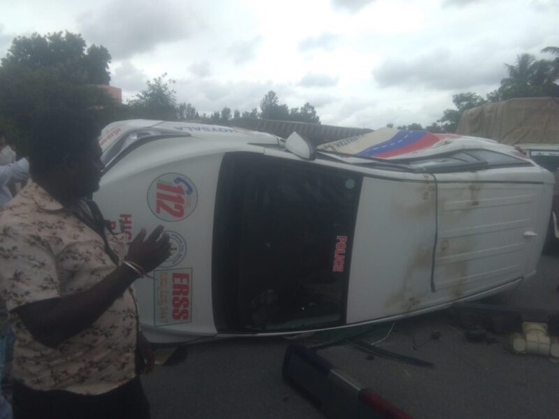 Due to the impact the patrolling vehicle turned turtle and the two policemen including the driver struck inside the car upside down.