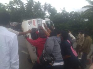 The Vijayapura police rushed to the spot and with the help of the public put the car back on its wheels.Traffic was disrupted for sometime and the police managed to ease the traffic after some time.