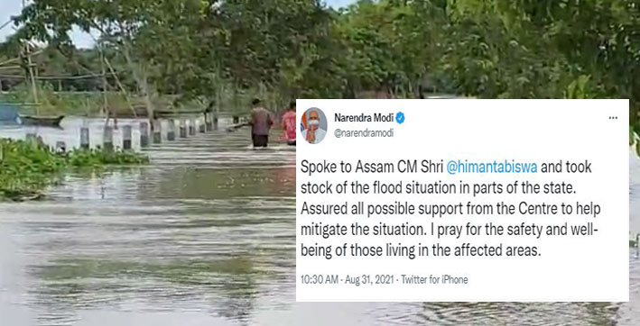 “Spoke to Assam CM Shri @himantabiswa and took stock of the flood situation in parts of the state. Assured all possible support from the Centre to help mitigate the situation. I pray for the safety and well-being of those living in the affected areas.”