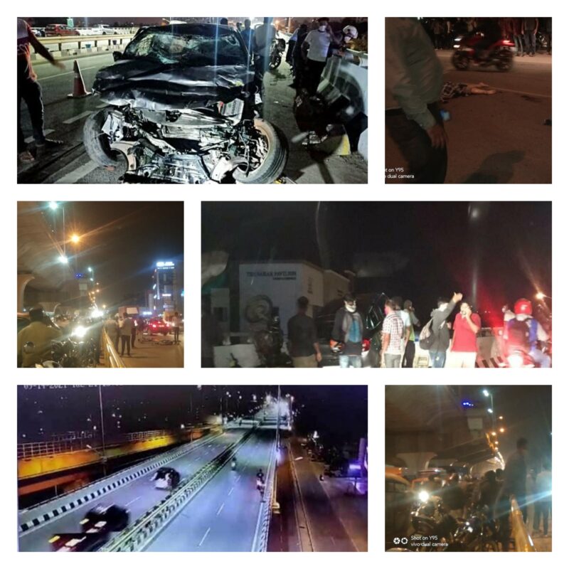 Due to the impact the duo threw up in the air and fell on the service road below the flyover and skidded to around 100 meters.