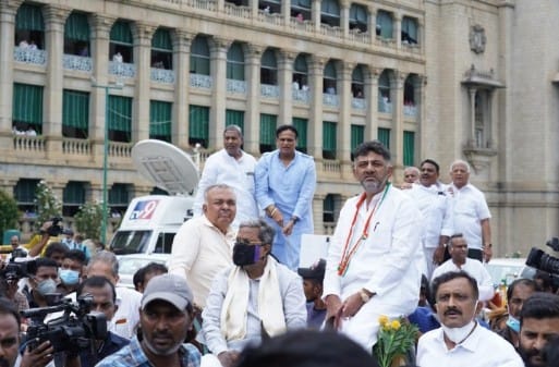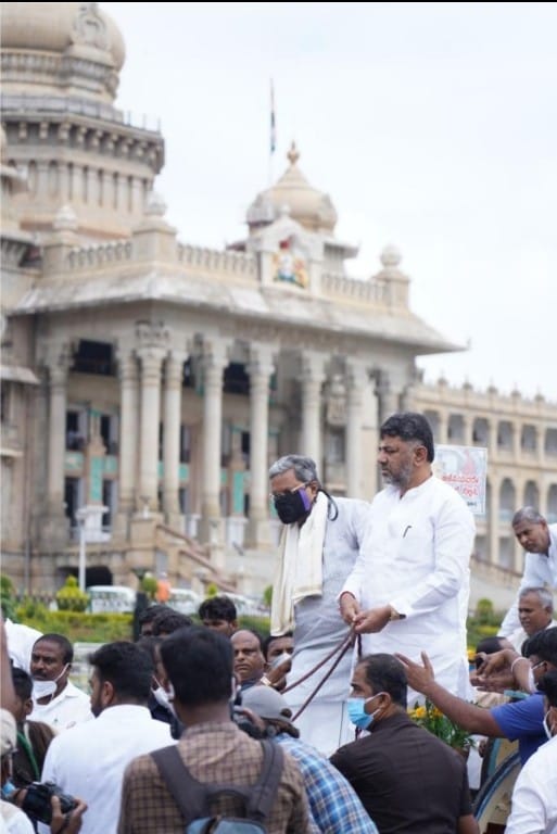 KPCC President D.K. Shivakumar, Leader of the Opposition in the Assembly and Siddaramaiah. The Congress,which was formerly headed by Patil,held the Yadav Gadhi and Cycle Jatha,which today held the Tonga Jatha from the KPCC office to the Vidhan Sabha.