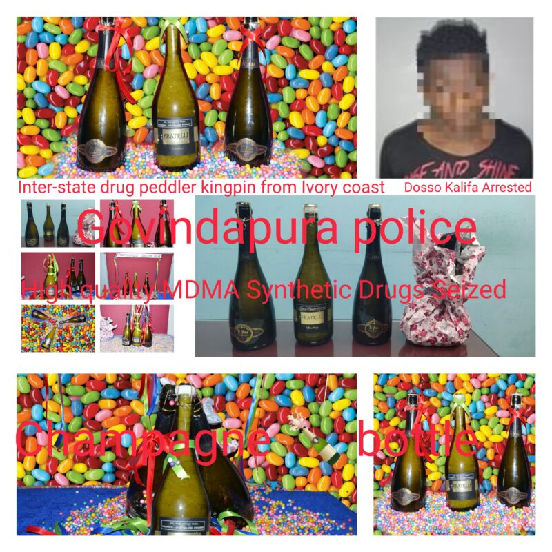 Acting on a tip-off,the Govindapura police inspector and crime staff rushed to the spot and kept a close watch on the foreign national and intercepted the peddler while he was trying to sell MDMA crystals in his car on a service road at HBR Layout.We arrested him and recovered drugs,from the champagne bottle.