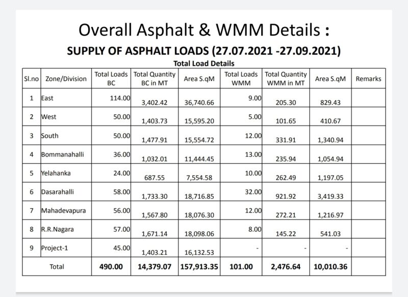 From the Hot Mix place in the BBMP limits 2021 June to 27th September around 490 load (14,379.07 metric ton) tar has been used and a total of 157,913.35 sq mt road potholes have been closed.