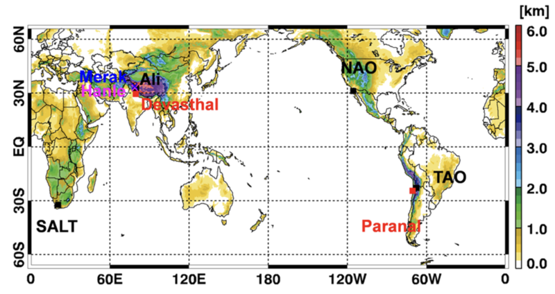 On the other hand, the cloud cover fraction for Hanle, Merak, and Devasthal in India and Ali in China were 66-75%, 51-68%, 61-78%, and 61-75%, respectively at various time resolutions using satellite-era and reanalysis data. Studying the variation of atmospheric parameters from 1980 to 2020 for all sites, the researchers found decreasing trends for the cloud cover fraction over the central region of Africa, the Eurasian continent, and the American continents, but increasing trends in the maritime region as well as land regions in the Sahara Desert, the Middle East, Indian sub-continent, the Tibetan Plateau and some of the Southeast Asian islands. This was possibly caused by global warming and associated water vapour changes in land-oceanic regions.