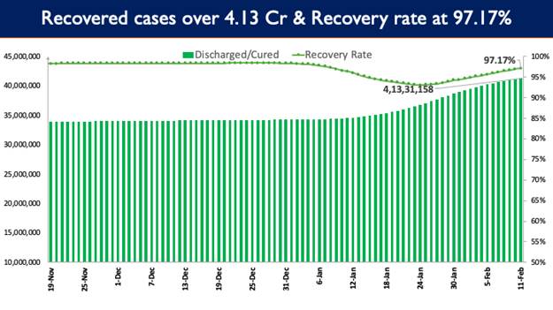 1,50,407 patients have recovered in the last 24 hours and the cumulative tally of recovered patients (since the beginning of the pandemic) is now at 4,13,31,158.