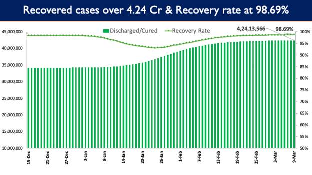 7,416 patients have recovered in the last 24 hours and the cumulative tally of recovered patients (since the beginning of the pandemic) is now at 4,24,13,566.