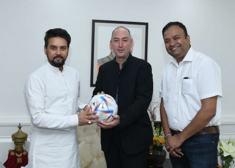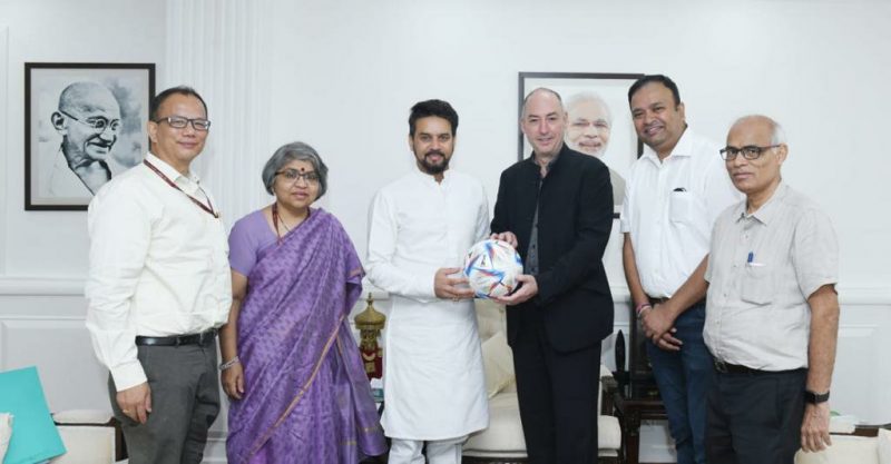 Jaime Yarza, Director Tournaments, FIFA and Mr. Sunando Dhar, Acting General Secretary, All India Football Federation called on Shri Anurag Thakur, Minister for Youth Affairs and Sports, also Minister of Information and Broadcasting earlier today (Wednesday, July 13, 2022).