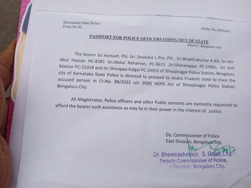 Based on his information,a team of police led by Avinash,Dikshith,(probationary PSI),Bhakta Kumar ASI,and constables,Mir Abdul Hasan, Abdul Rahman,Sharana Basappa,Anil Mulik and Shivappa Kalagi along with an informant linked to the peddlers,hired two cabs and left to Chittoor to nab the peddlers .