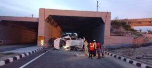 The incident occurred in the wee hours when the driver identified as Maxwell driving in high speed , suspected to have dozed off and collided with the median while negotiating underpass .