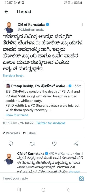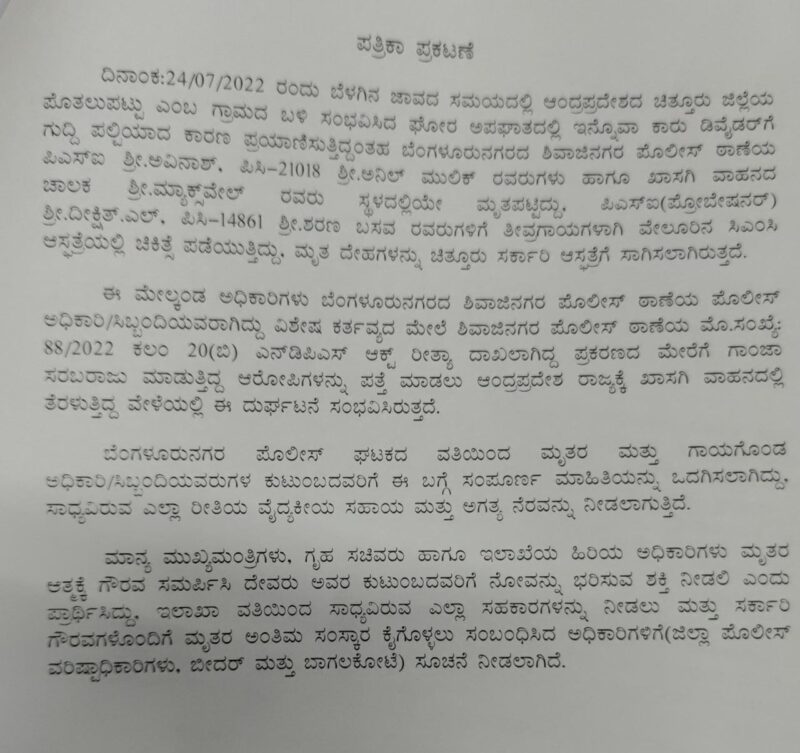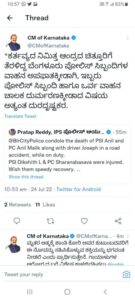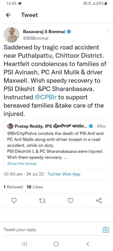 CM Bommai by tweeting said,Saddened by tragic road accident near Puthalpattu, Chittoor District. Heartfelt condolences to families of PSI Avinash, PC Anil Mulik & driver Maxwell.Wish speedy recovery to PSI Dikshit&PC Sharanbasava. Instructed @CPBlr to support bereaved families &take care of the injured.