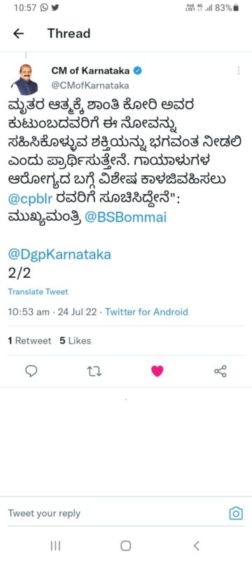 @CMofKarnataka @DgpKarnataka,C H Pratap Reddy commissioner of police said in his tweet.