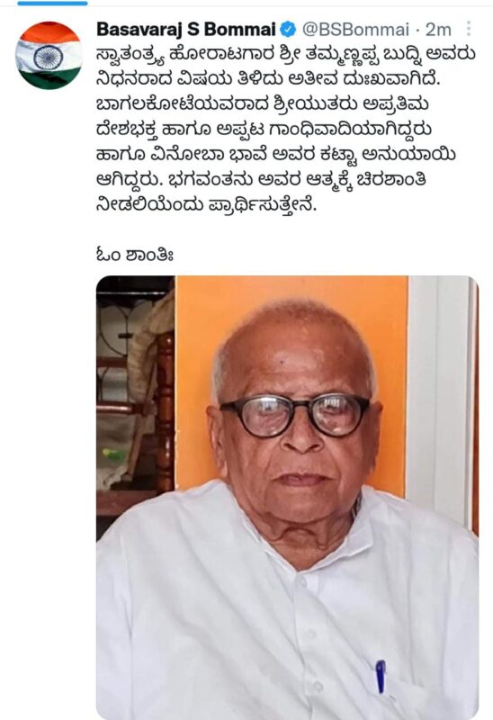 Chief Minister Basavaraj Bommai has condoled the passing away of veteran freedom fighter of Bagalkote,Thammannapa Budni on Tuesday.