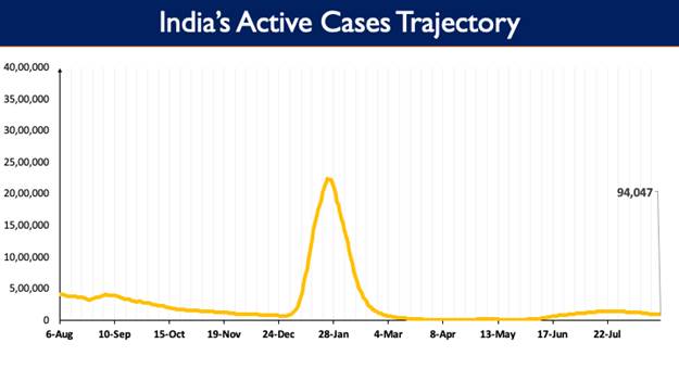 India’s Active Caseload currently stands at 94,047. Active cases now constitute 0.21% of the country’s total Positive Cases.