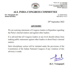#RajasthanPoliticalCrisis | INC advises all leaders of the party to “refrain from making public statements against any other leaders or about Party’s internal matters.” The party also warns of “strict disciplinary action” if any violation of this advisory is made.