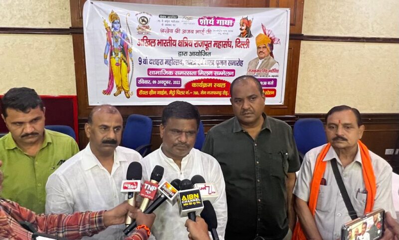 नई दिल्ली- समाज के उपेक्षित सभी वर्गो की सेवा करना क्षत्रियों का कर्तव्य है। यह विचार कल राज कमार सिंह भदोरिया अखिल भारतीय राजपुत महासंघ के दिल्ली प्रदेश के अध्यक्ष ने प्रेस कल्ब आफ इण्डिया में पत्रकार बार्ता के दौरान कही ‘ उन्होने बताया कि दिन रविवार दिनांक 9 अक्तुबर 22 दिल्ली के रायल ग्रीन गार्डन, मेट्रो पिलर न० 760 मैन नजफगढ रोड , मनसा राम पार्क उत्तम नगर नई दिल्ली में दशहरा महोत्सव एवं शास्त्र व शस्त्र पूजन भव्य कार्यक्रम आयोजित कर रहा है।इस कार्यकम में देश भर से क्षत्रिय समाज की महान व अति विशिष्ट हस्तियाँ शामिल होगी ।