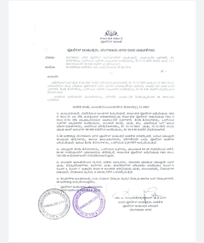 The order was made under Karnataka Police Act allowing the eateries, hotels and restaurants to function till 3.30 am from the existing 1am for two days .