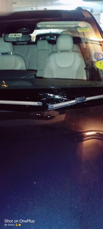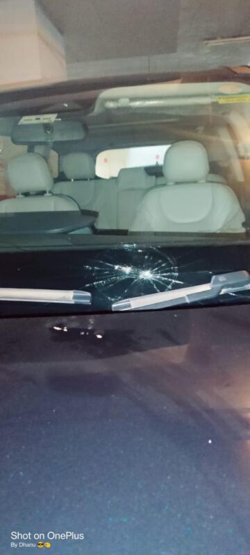 The complainant,Ritesh,was passing through the metro station when a metal piece crashed on his windshield and damaged.