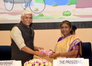 The “Swachh Sujal Shakti Samman 2023”, organized by the Ministry of Jal Shakti to honour the women champions of rural water and sanitation sector, was graced by the President of India, Smt. Droupadi Murmu. This event organized in the run up to the International Women’s Day, was to felicitate the exceptional and exemplary work being done at the grassroots level by women in the implementation of Swachh Bharat Mission – Grameen (SBM-G), Jal Jeevan Mission (JJM), Jal Shakti Abhiyan: Catch the Rain (JSA-CTR). 36 women WASH Champions were conferred with the ‘Swachh Sujal Shakti Samman 2023’ by the President of India and Union Minister of Jal Shakti. The event also saw the launch of Jal Shakti Abhiyan – Catch the Rain 2023 and release of National Water Mission’s(NWM) SoPs on Source Sustainability by Minister of Jal Shakti Sh. Gajendra Singh Shekhawat. Union Minister also presented President with the first copy of the ‘Swachh Sujal Shakti Ki Abhivyakti’ – a compendium of case stories from SBM (G), JJM and NWM. A customized ‘My Stamp’ for NWM was launched by Minister of State for Communications Sh. Devusinh Jesingbhai Chauhan, who also presented the first copy to President.