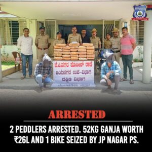 In a similar incident, the JP Nagar police arrested two peddlers recovered 52 kilos of Marijuana worth Rs.26 lakh from them.