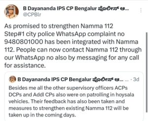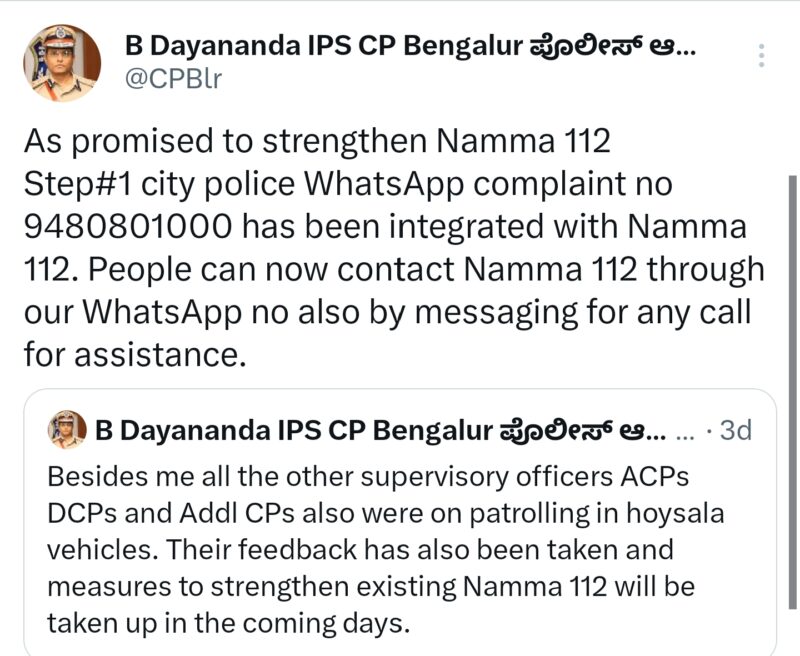 Reacting on twitter he said “As promised to strengthen Namma 112-Step#1 city police WhatsApp complaint no 9480801000 has been integrated with Namma 112.
