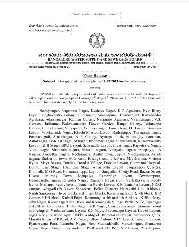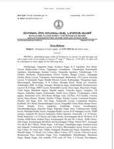 Bengaluru to face water supply disruption on July 13: List of areas
