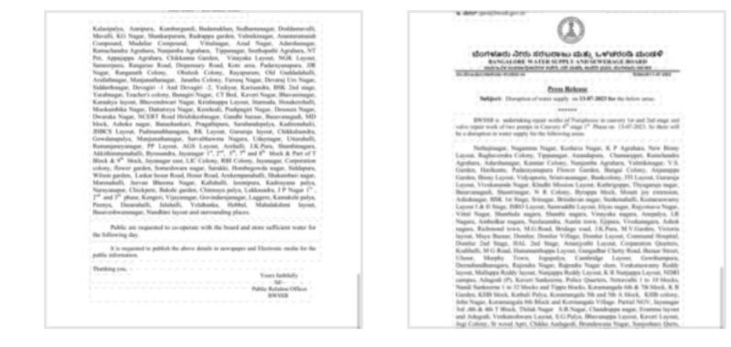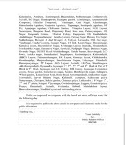 Therefore,there will be variation in Cauvery water supply in the following areas on Date: 13th July Thursday from 10 am to 4 pm.