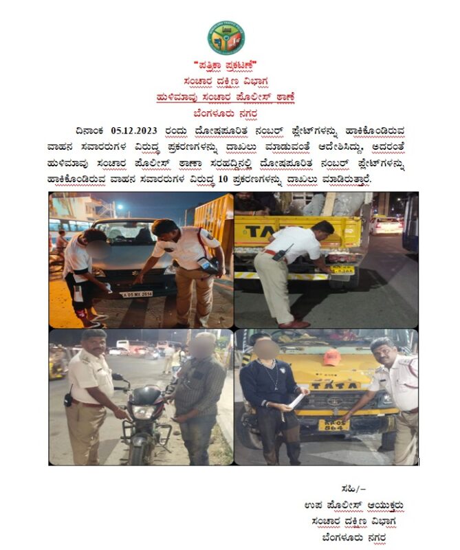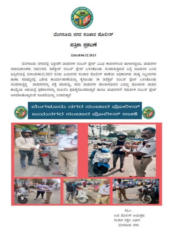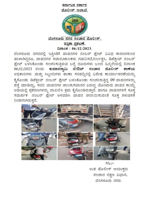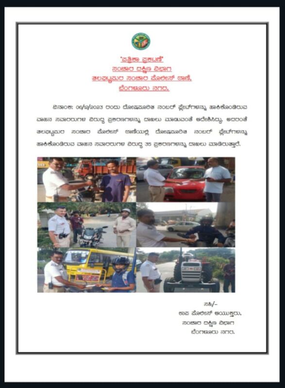 I n a special drive,the electronic city traffic police,Mico layout,Jayanagar, Thalaghattapura traffic cops booked hundreds of motorists plying with defective number plates to avoid enforcement cameras.