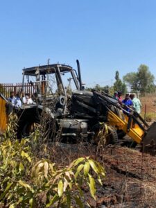 The Rajanakunte police arrested a 63-year-old farmer and his 33-year-old son setting fire to JCB and attacked the revenue department officials during anti encroachment drive at Shivakote village in Yelahanaka taluk on Wednesday .