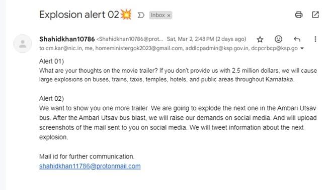 The email identified from Shahid Khan warned attacks at public transport and places including Ambari utsav bus facility.
