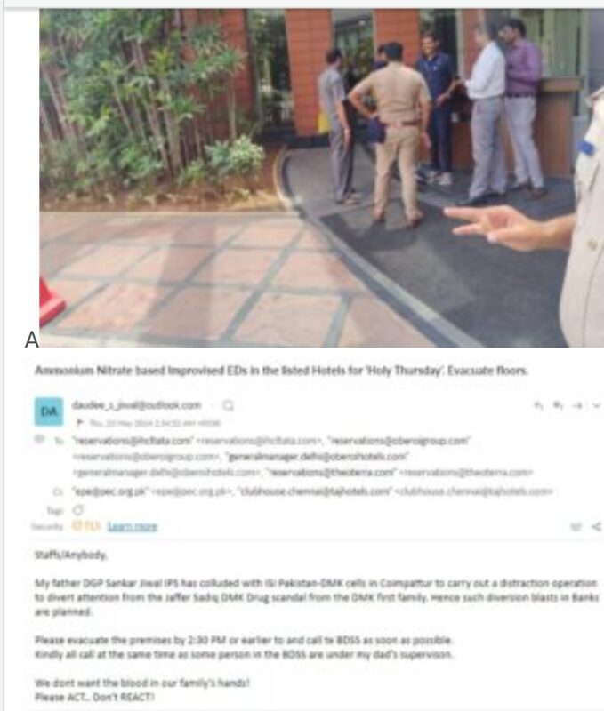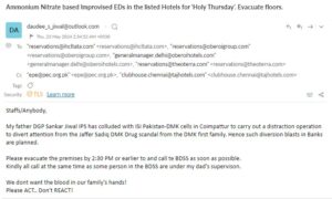 The person identified himself as daudee jiwal claiming to be son of senior IPS officer emailed to the front desks of star hotels claimed that bombs are planted.