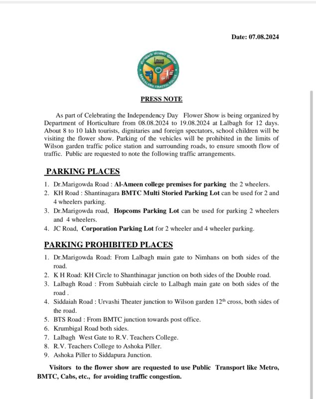 Parking banned on Dr.Marigowda Road from Lalbagh main gate to Nimhans on both sides of the road.K H Road: KH Circle to Shanthinagar junction on both sides of the Double road.Lalbagh Road from Subbaiah circle to Lalbagh main gate on both sides of the road .