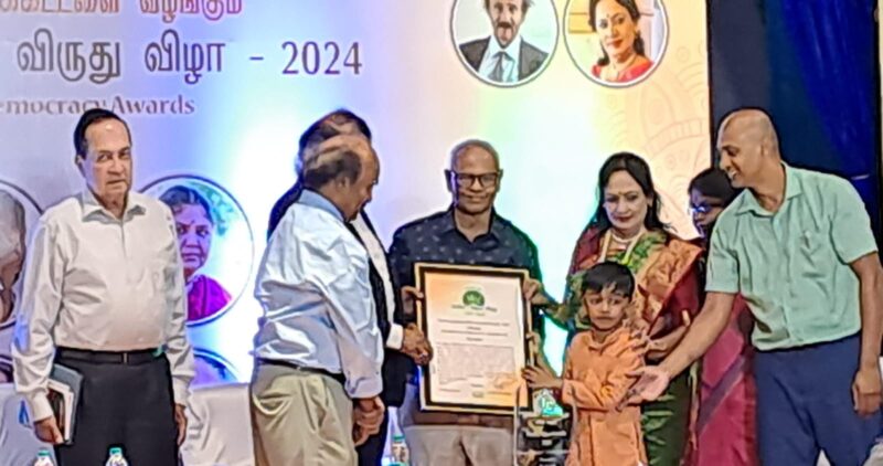 Chennai:Five eminent personalities were honoured with The Champion of Democracy Awards 2024.The awardees include Justice,K.Chandru,former Madras High Court Judge,K.Balabharathi,former MLA and senior CPI(M) leader,U.Sagayam,former IAS officer,N.Ram, veteran journalist and Director,The Hindu Group Publishing Private Limited,and Mr Indran,veteran art critic and writer.