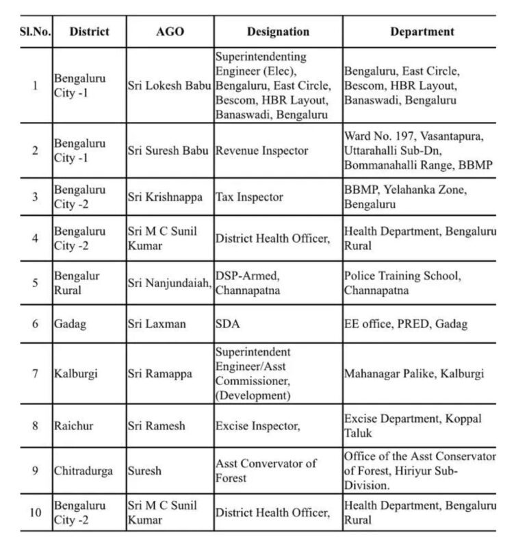 Officials also raided properties belonging to Sunil Kumar, district health officer in Bengaluru Rural,and Nanjundayya,an Deputy Superintendent of Police at the Channapatna Police Training School,Lakshman,SDA, Executive Engineer officer,Gadag,Ramappa, Superintendent engineer,(assistant commissioner), Kalaburagi Mahanagara Palike,Ramesh Excise Inspector , Koppal Taluk Raichur district,Suresh,Assistant Conservator of Forest,Hiriyur sub division,Chitradurga , MC Sunil Kumar,District health officer,Bengaluru district.