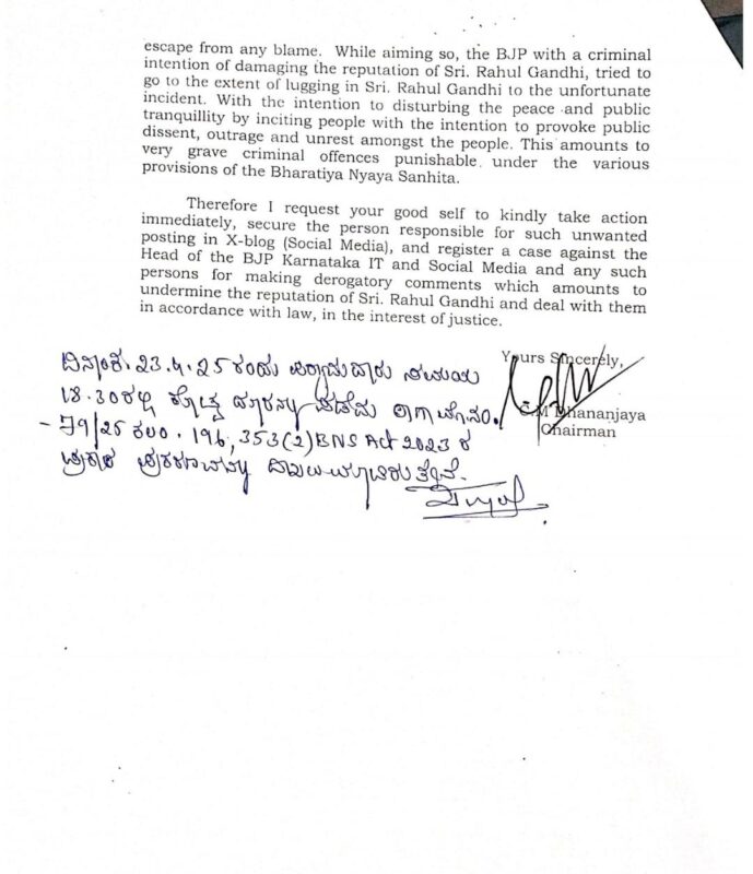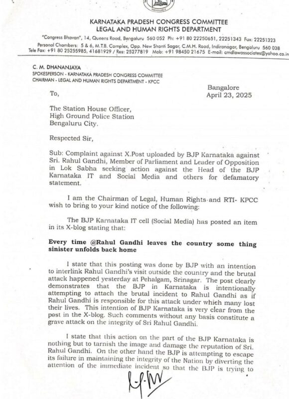 CM Dhananjaya,spokesperson and chairman of KPCC legal and human resources department said that the BJP IT cell post on social media wrote on Rahul Gandhi’s foreign trip to link the brutal attack in pahalgam Srinagar.