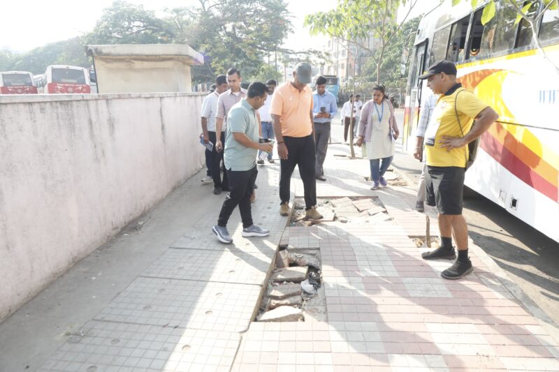 He inspected the footpath adjacent to the bus stand near Shantala Silk Junction.He observed that there was additional space inside the bus stand and instructed them to take appropriate measures to widen the footpath.