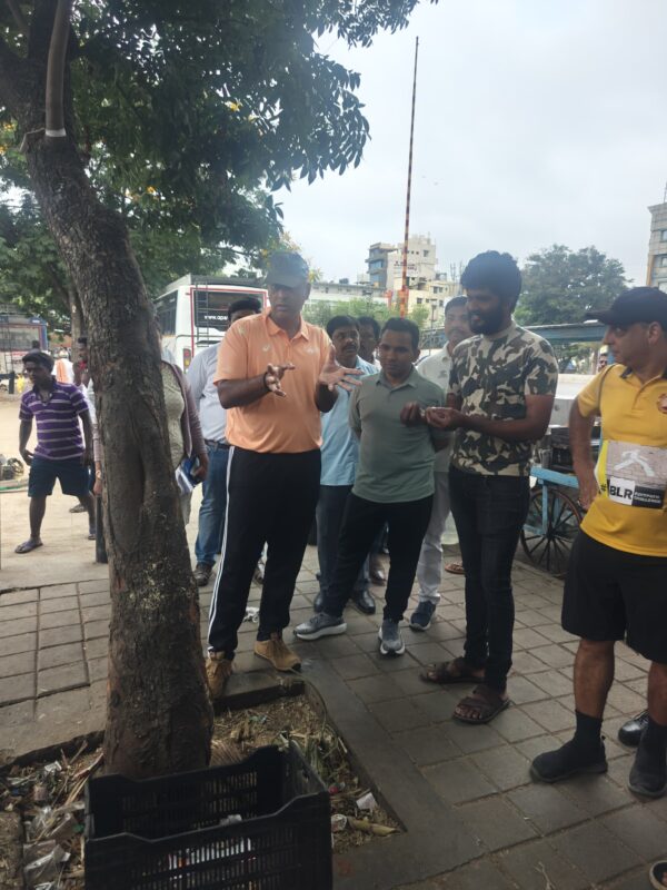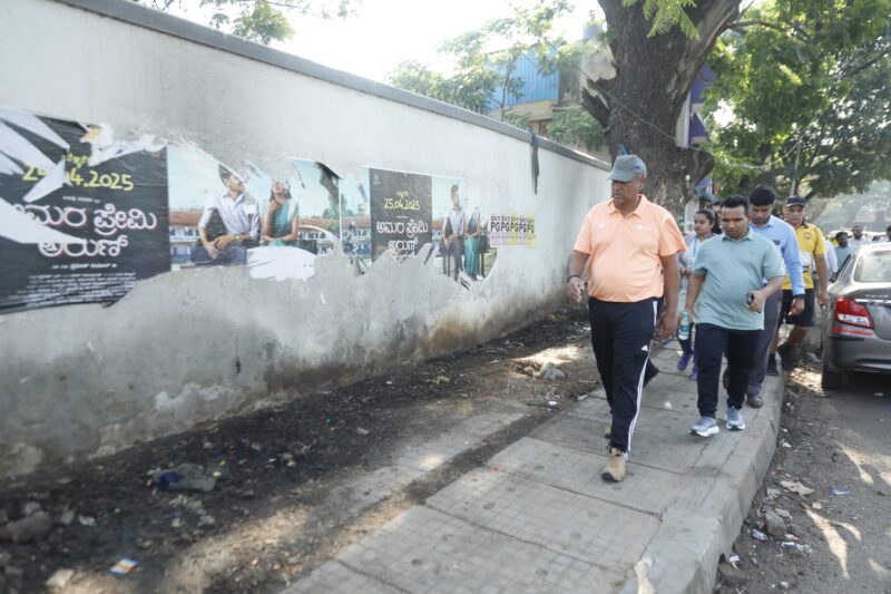Today morning from 6.30 to 8.30 am,a 2.5 km long footpath including Gubbi Thotadappa Road,Dhanwantari Road,Tank Bund Road and the bus stand around Majestic was inspected by walking and the officials were instructed to resolve the existing problems.