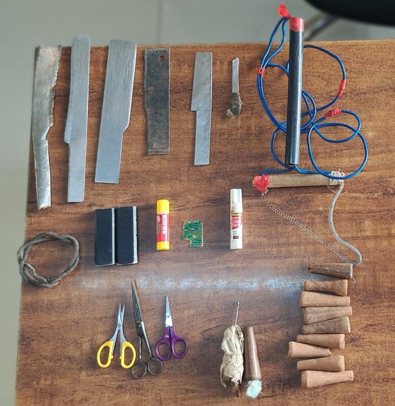 The other recoveries include,1 Trimmer,2 Chargers,2 Scissors,1 Small Iron Rod,2 Knife-Like Sharp Objects,6 Packs Of Sk Beedis,1 Box Of Matches,1 Lighter,1 Chinese Brand Of Tobacco at A block barrack while at Barrack No B1.B2,the officials recovered 6 Knives,1 Water Heater,1 Metal String,2 Black Knife Handles,2 Glue Sticks,3 Scissors,9 ganja Pipes,1 ganja Filler,1 Cloth Filled Chillum.