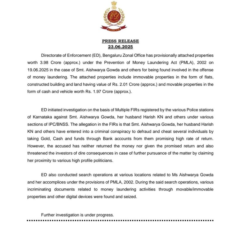 Meanwhile ED officials provisionally attached properties worth Rs.3.98 Crore under the Prevention of Money Laundering Act (PMLA),2002 on thursday related to Aishwarya Gowda and others for being found involved in the offense of money laundering.