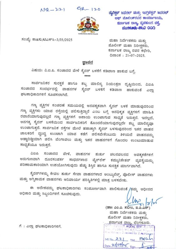 In a move aimed at ensuring public safety and controlling noise pollution, the Director General and Inspector General of Police (DG & IGP) of Karnataka Dr M A Saleem has issued a directive to all unit heads, instructing them to limit the use of sirens during VIP movements.